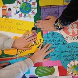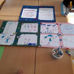 | Kinder gestalten eine Plakatwand zum Thema Demokratie. Einstieg mit Video von Checker Tobi; Gesprächsrunde zu Vorwissen; Malaufgabe; Beispiel demokratischer Wahlen als Impuls; daraus entstand ein gemeinsames Kunstwerk. Am 30.04.2026 erneute Aktion in den Pausen zum Thema Demokratie (malen und schreiben). | 19.01.–23.01.2026 | Ganztagsbetreuung Meisterschule | Frau Kerstin Daniel |